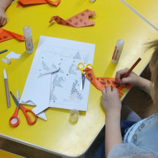 Сегодня мы с ребятами поближе познакомились с жирафом. Узнали его рост, чем он питается, как спит. Решили сделать себе такого питомца...из бумаги). Ещё раз закрепили навыки работы в технике оригами: складывание пополам, вспомнили как из прямоугольного листа сделать квадрат, сгибание в разных проекциях. Потом дополнили поделку пятнышками.