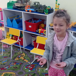 Потом мы сыграли в игру с орешками. Здесь закрепили состав числа 5. Один ребенок брал 2, 3 или 5 орешков, отворачивался и раскладывал их в две кулачки. Ребята пробовали угадать в какой руке сколько.